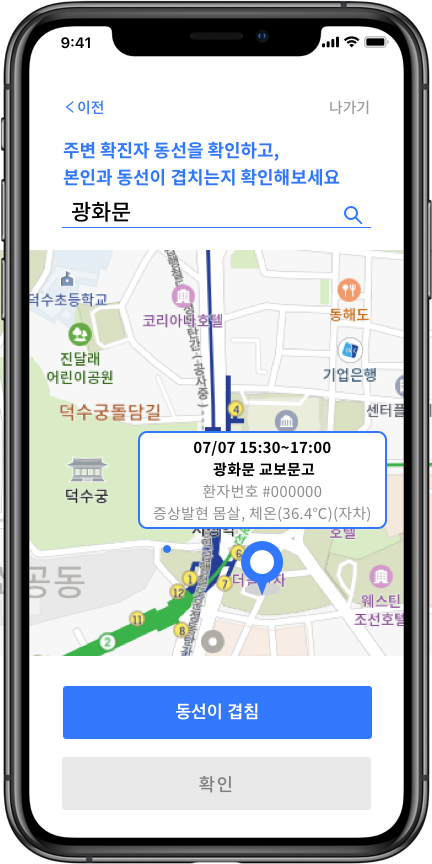 Step 3. 지도에서 확진자 동선을 확인하고, 본인과 동선이 겹치는 여부를 선택 (현재 준비중)