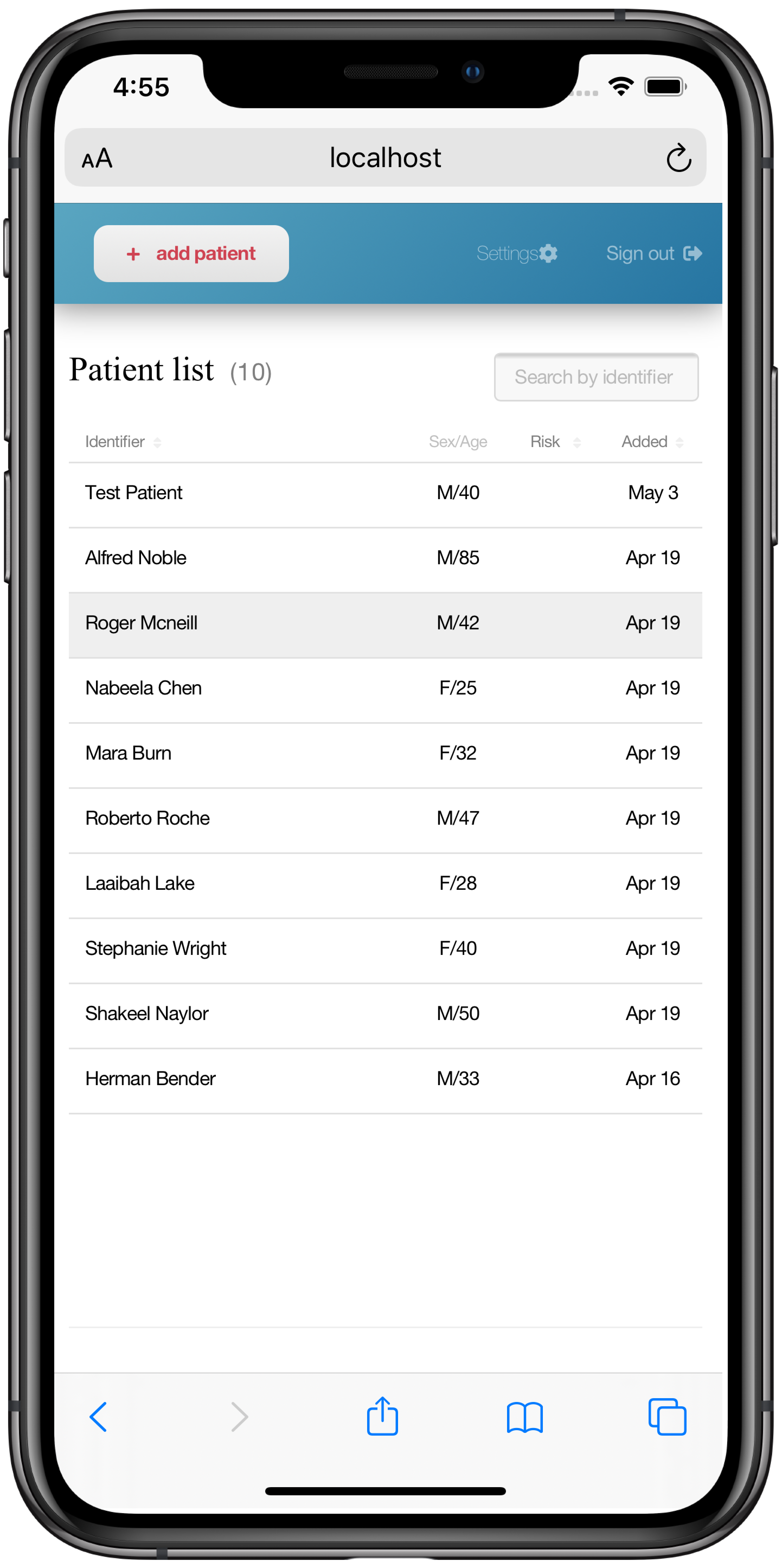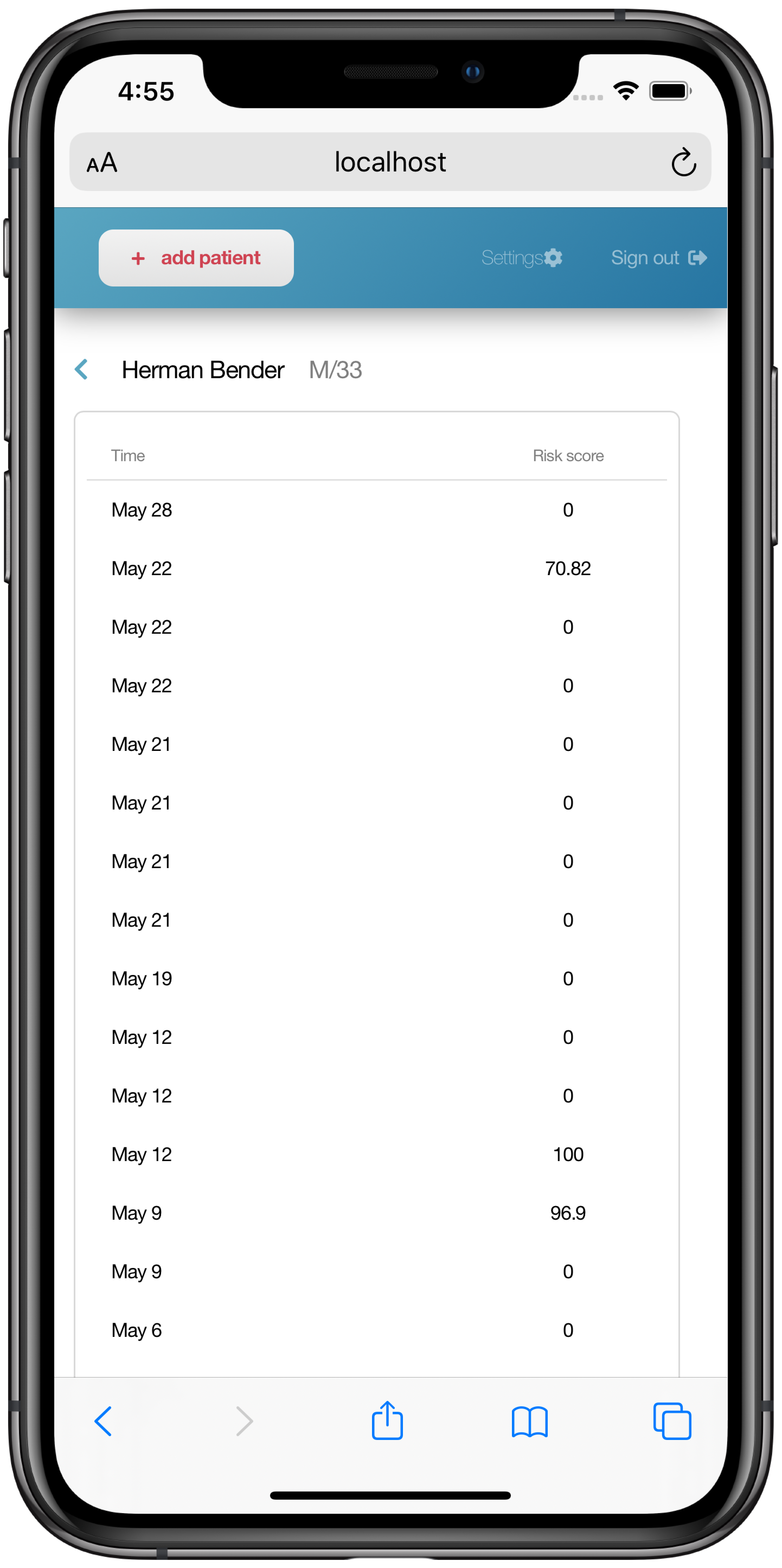 의료진용앱 : 환자 리스트 확인 및 증상 변화, 그리고 이에 따른 AI위험도 예측값 확인