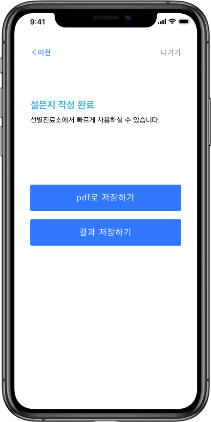 만약 선별진료소를 방문해야한다면 효율적인 진료를 위해 설문지를 출력해갈 수 있습니다.