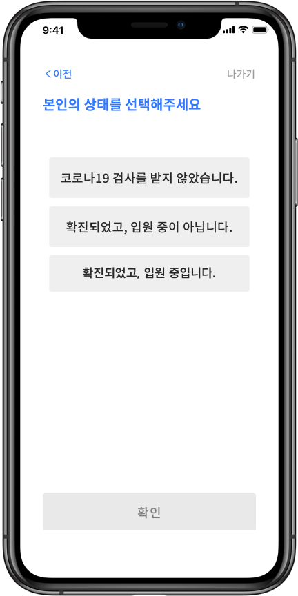 Step 2. 본인의 상태를 <코로나19 검사를 받지 않았습니다>를 선택
