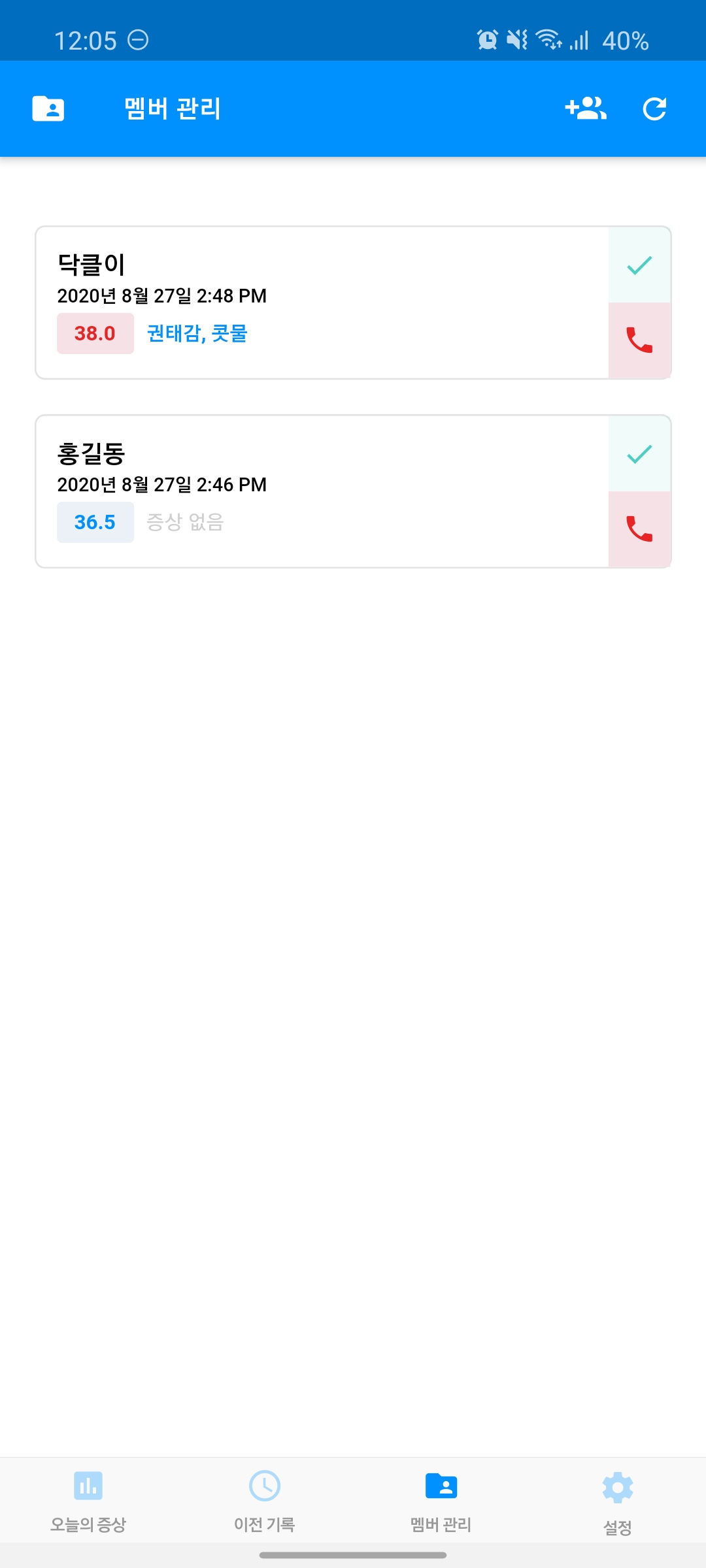 관리자를 등록한 상태에서, 매일 본인이 본인의 증상을 체크하면 자동으로 관리자에게 전송이되고,
