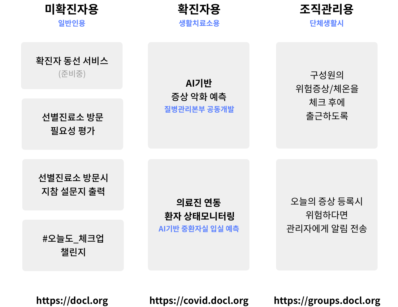 DOCL(닥클)의 서비스는 미확진자용, 확진자용, 조직관리용 이렇게 세가지로 나뉩니다.